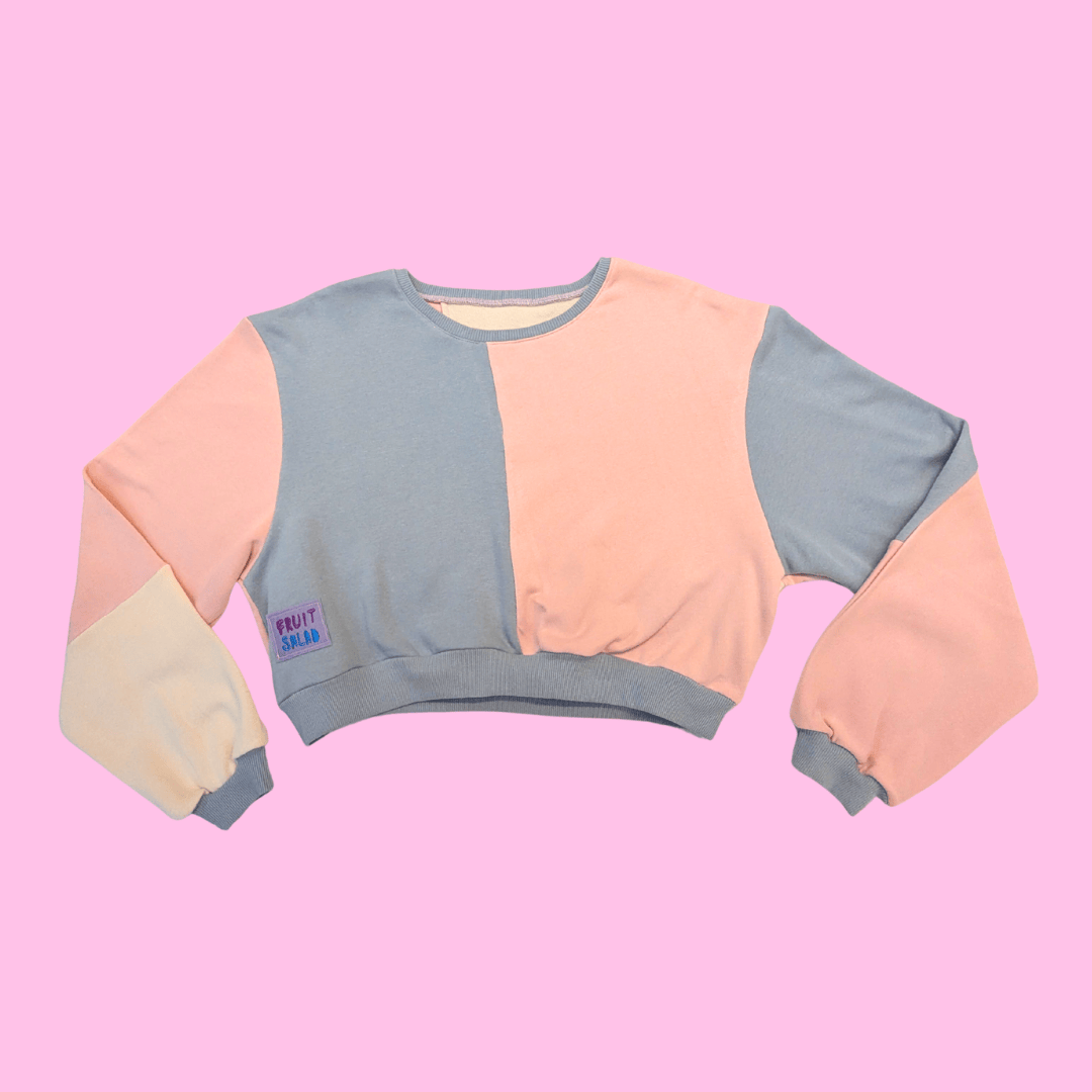 A unique patchwork sustainable crop sweatshirt in powder blue, dusky pink & cream